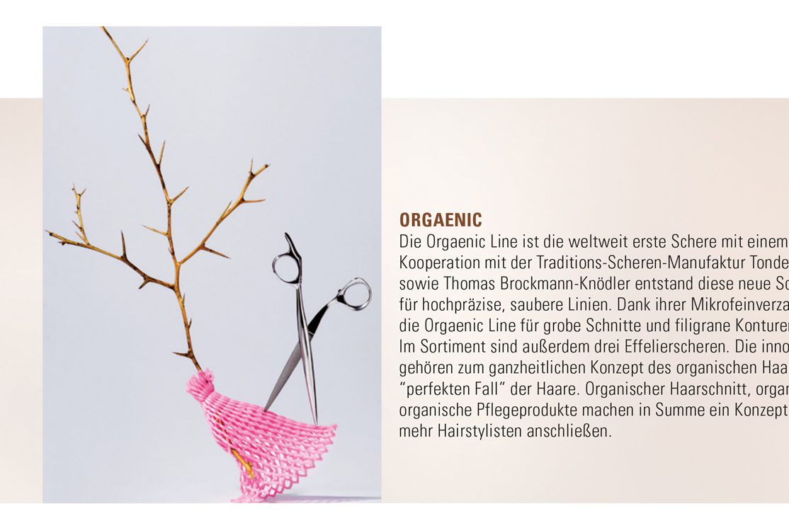 In Kooperation mit der Traditions-Scheren-Manufaktur Tondeo und Petra Brockmann sowie Thomas Brockmann-Knödler entstand diese neue Scherengeneration für hochpräzise, saubere Linien. Dank ihrer Mikrofeinverzahnung eignet sich die Orgaenic Line für grobe Schnitte und filigrane Konturen gleichermaßen. Im Sortiment sind außerdem drei Effelierscheren…